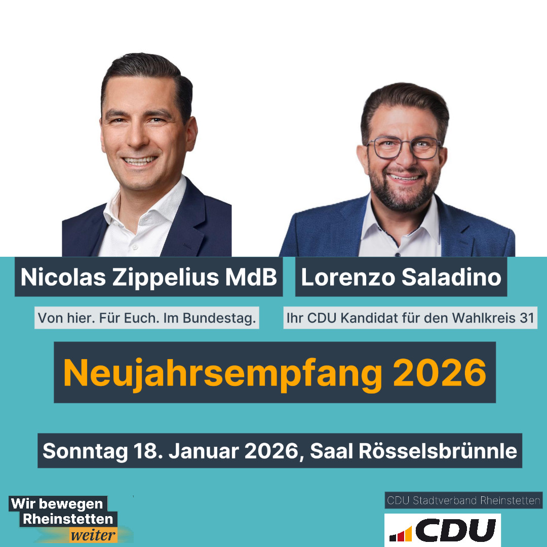 mehrDer Stadtverband Rheinstetten lädt herzlich zum Neujahrsempfang 2026 ein.Sonntag, 18. Januar 2026, um 11:00 Uhrim Saal RösselsbrünnleRappenwörthstraße 39, 76287 Rheinstetten#cdurheinstetten #nicolaszippelius #lorenzosaladino #neujahrsempfang #neujahrsempfang2026